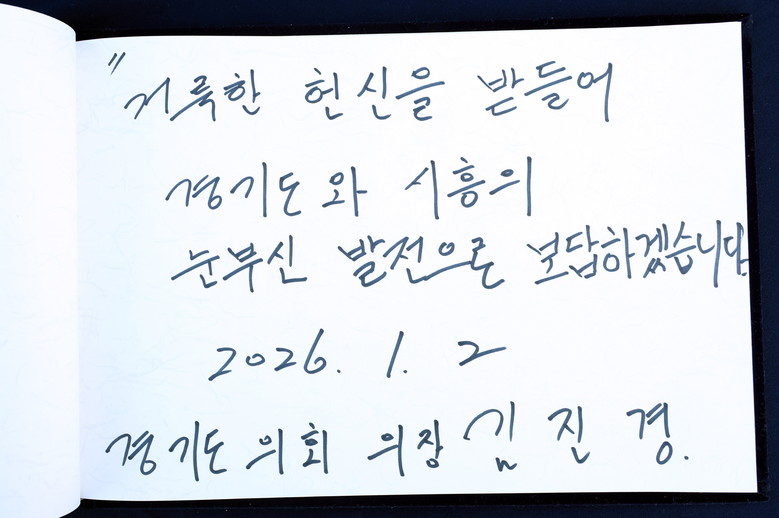 방명록에는 ‘거룩한 헌신을 받들어 경기도와 시흥의 눈부신 발전으로 보답하겠습니다’라는 메시지를 남겼다.