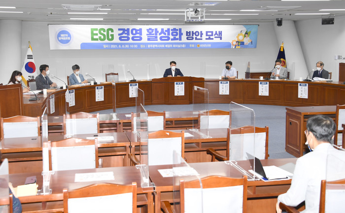 [광주=세계타임즈 손권일 기자] 기업의 사회적 책임 등을 강조하는 ESG 경영이 새로운 화두로 급부상하고 있는 가운데 광주광역시의회 이정환 산업건설위원장(더불어민주당, 광산5)이 좌장을 맡은 ‘ESG경영 활성화 방안 모색’을 위한 정책토론회가 8일 오후 4시 시의회 5층 예산결산특별위원회실에서 개최됐다.