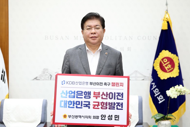 [부산 세계타임즈=이용우 기자] 안성민 부산광역시의회 의장이 11일 KDB산업은행의 부산 이전 촉구를 위한 ‘산업은행 이전 챌린지’에 동참했다고 밝혔다.