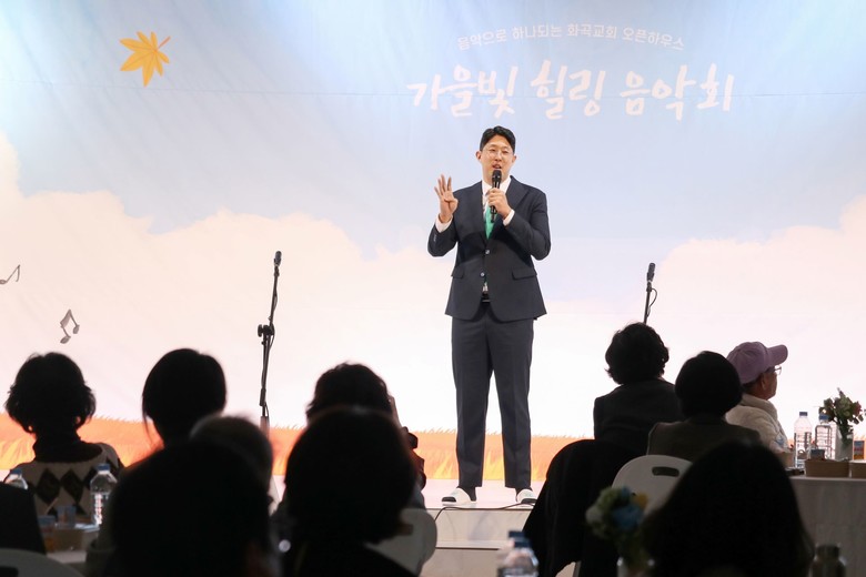 | ▲ 지난 25일 신천지 화곡교회에서 열린 ‘오픈하우스 가을빛 힐링 음악회’에서 백도훈 담임강사가 축사를 하고 있다. [사진 제공 = 신천지 화곡교회] |