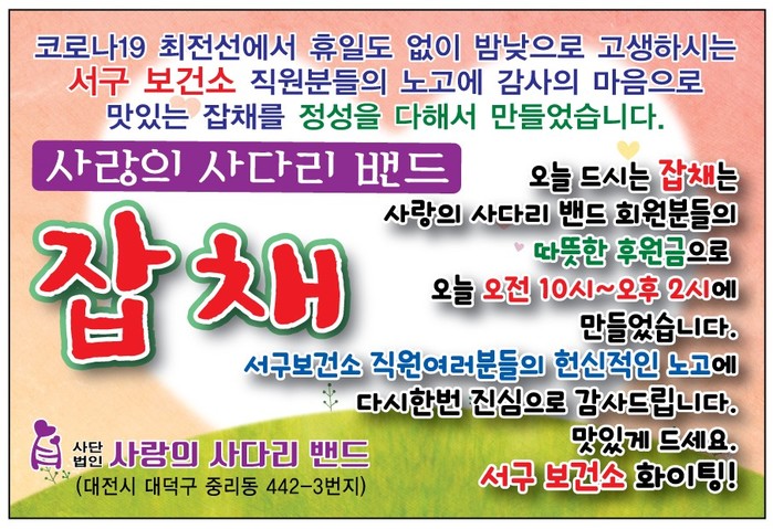 김호현 이사는 “코로나19 최전선에서 휴일도 없이 밤낮으로 고생하시는 서구보건소 직원분들의 노고에 감사의 마음으로 간식으로 잡채를 준비했다.”고 말했다.