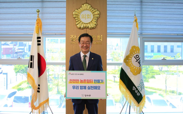 정덕교 장수경찰서장으로부터 지목을 받아 이번 캠페인에 동참한 장정복 의장은 이날 ‘안전한 농촌일터 만들기 우리 함께 실천해요’ 구호가 적힌 피켓을 들고 농업인 안전 캠페인 참여를 홍보했다.