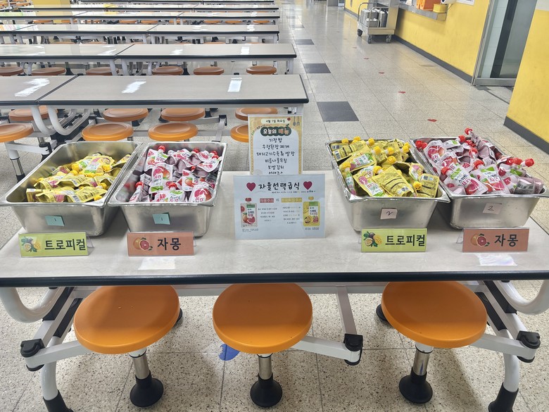 첫 번째 선택급식으로는 후식 음료인 자몽맛주스와 트로피컬주스가 제공하였다. 자율선택급식 날을 맞아 교장과 교감은 배식도우미로 나서 학생들에게 직접 급식을 제공하며 프로그램의 원활한 진행을 도왔다.