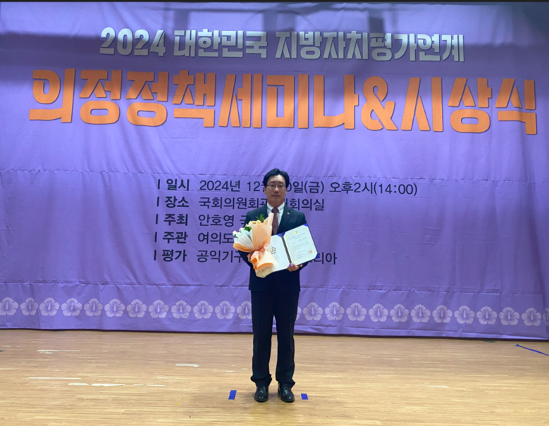 [부산 세계타임즈=이용우 기자] 여의도정책연구원이 주관하는 ‘2024 대한민국 지방자치평가연계 의정정책대상’ 광역의회 부문에서 부산광역시의회 해양도시안전위원회 김광명 의원(국민의힘, 남구4)이 대상을 수상했다.