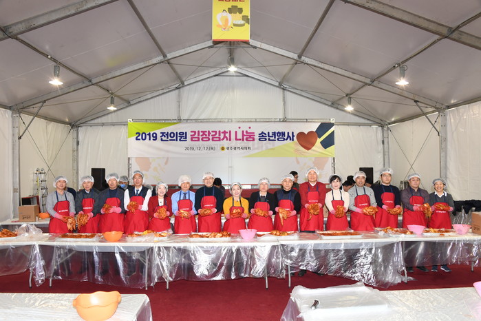 [광주=세계타임즈 손권일 기자] 광주광역시의회 김동찬 의장을 비롯한 시의원들과 시의회사무처 임직원은 지난 12일 김치타운 다목적체험관에서 '2019 김장김치 나눔 송년행사'를 개최했다.