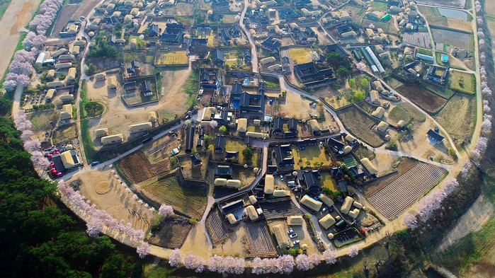 하회마을을 감싼 제방 위 벚꽃들도 초가와 기와등이 어우려져 색다른 풍경을 선사하고 있다. 안동시 농업기술센터에 핀 홍매화는 고혹적인 매력을 선사하고 있다.