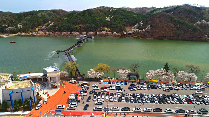 안동댐 보조호수를 가로 지르는 목책교와 만개한 벚꽃, 한창 물오르기 시작한 연두빛의 왕버들이 어우러져 산뜻한 봄의 아름다움을 선사하고 있다.