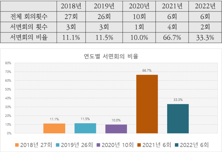 한 의원에 따르면, 지난해 총 230개 위원회가 개최한 651차례 회의 가운데 43.6%(284회)가 서면심의로 대체되었다. 코로나19 영향으로 비대면이 사회 주류 소통방식이었다고는 하나, 코로나19 이전인 2018년 서면심의 비율(44.5%)이 이보다 높아 서면심의가 관료주의.행정편의주의와 맞물려 일종의 관행이 된 것이 아니냐는 우려를 사고 있다.