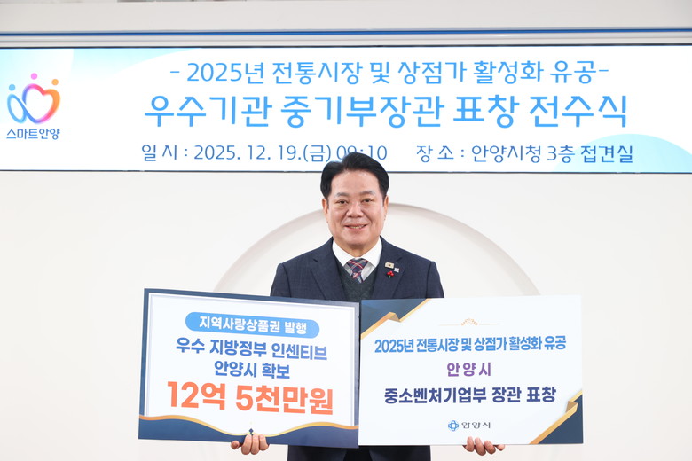 [안양시 세계타임즈=송민수 기자] 안양시(시장 최대호)는 중소벤처기업부가 주관한 ‘2025년 전통시장 및 상점가 활성화 유공’ 포상에서 우수 지자체로 선정돼 중소벤처기업부 장관 표창을 수상했다고 19일 밝혔다.