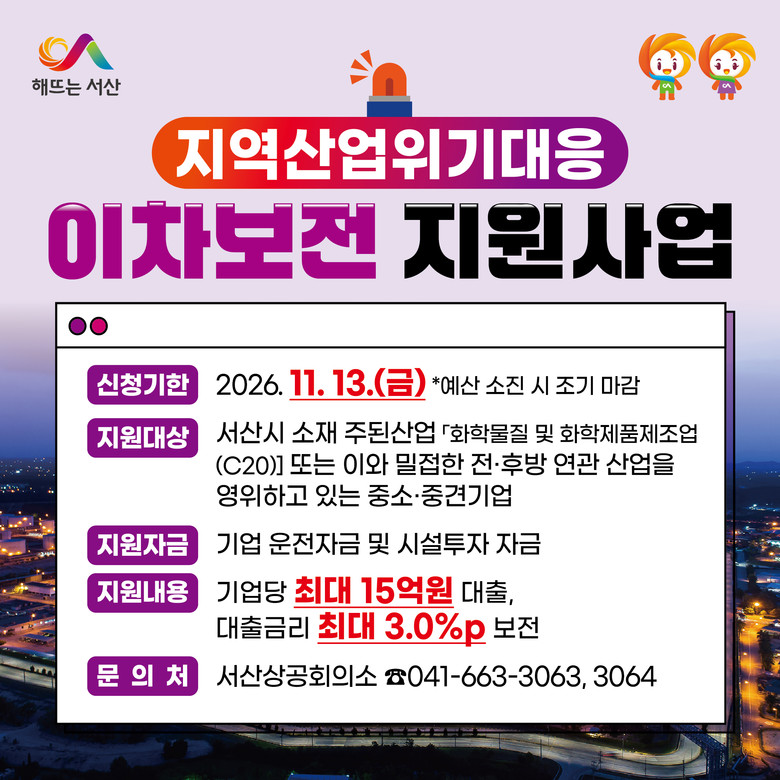 - 기업당 최대 15억 원 대출, 운전자금 이차보전 3% 등 지원 - [세계타임즈=서산시 이현진 기자] 충남 서산시가 지역 석유화학 관련 기업의 경영 안정을 위해 ‘2026년 지역산업위기대응 이차보전 지원사업’을 본격 추진한다고 밝혔다.