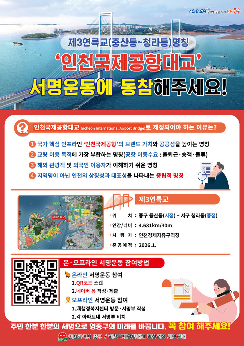 김정헌 중구청장은 “향후 국가지명위원회 재심의를 통해 제3연륙교 명칭이 ‘인천국제공항대교’로 관철될 수 있도록, 모든 행정 역량을 집중해 적극 대응해 나갈 방침”이라고 밝혔다.