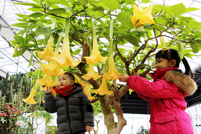 이곳에는 엔젤트럼펫뿐만 아니라 울긋불긋 포인세티아 등 200여 종의 온갖 식물들이 어우러져 봄소식을 제일 먼저 알리는 데 분주하다.