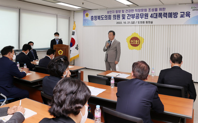 [충북 세계타임즈=이현진 기자] 충북도의회(의장 황영호)는 21일(금) 도의회 회의실에서 도의원과 간부 공무원 40여 명을 대상으로 4대 폭력 예방 통합교육을 실시했다.