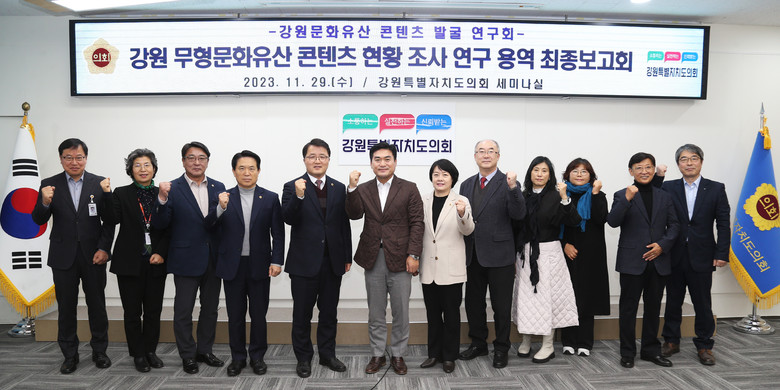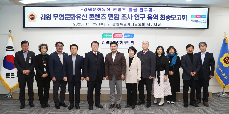 [강원도 세계타임즈=김민석 기자] 강원특별자치도의회 의원 연구회인 “강원 문화유산 콘텐츠 발굴 연구회”는 지난 29일 강원특별자치도의회 세미나실에서 강원 무형문화유산 콘텐츠 현황 조사 연구용역 최종보고회를 개최했다.