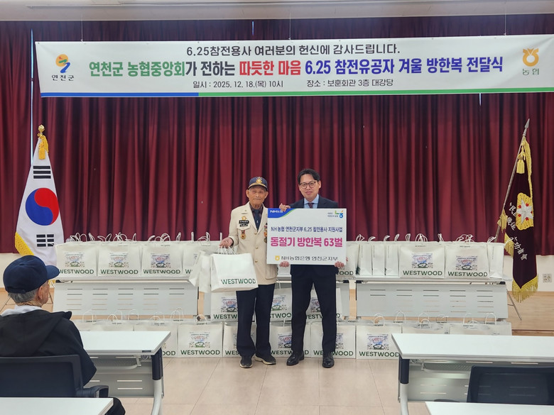 [연천군 세계타임즈=송민수 기자] NH농협 연천군지부(지부장 한창기)는 18일 연천군 보훈회관에서 연천 관내 6.25 참전유공자에 감사와 사랑의 마음을 담은 600만원 상당의 위문품(동절기 방한복)을 전달했다.