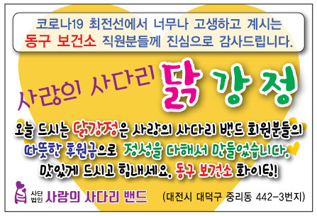 장선애 동구보건소장은 “오늘 사랑의 사다리 밴드 봉사단체에서 맛있는 닭강정을 지원해 주어서 큰 힘과 위안이 된다,”면서 “동구보건소는 코로나19 종식을 위해서 최선을 다하겠다.”고 말했다.