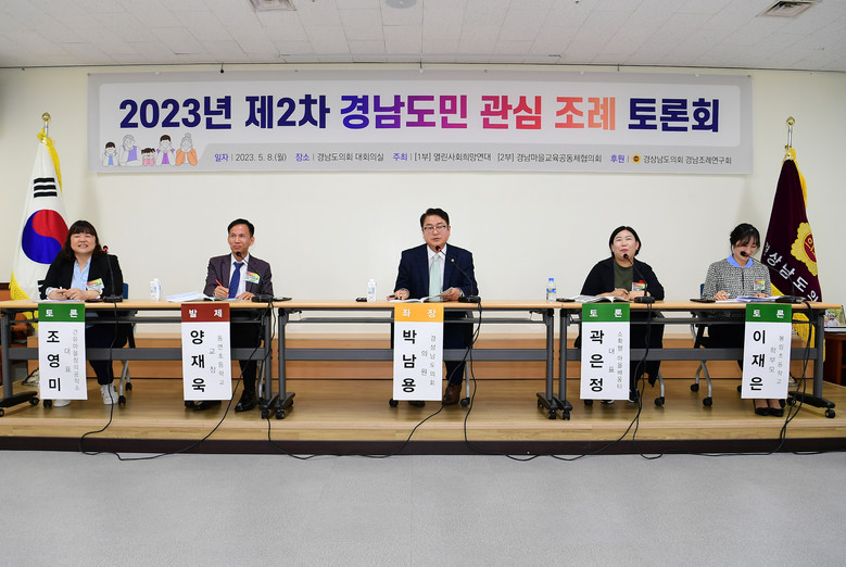 [경남 세계타임즈=최성룡 기자] 경상남도의회 의원 연구단체인 경남조례연구회(회장 박춘덕)는 지난 8일 오후 2시 경상남도의회 대회의실에서 ‘2023년 제2차 경남도민 관심 조례 토론회’를 개최했다. 토론회는 1부, 2부로 나누어 진행됐으며 각각 ‘열린사회희망연대’, ‘경남마을교육공동체협의회’에서 주최했다.