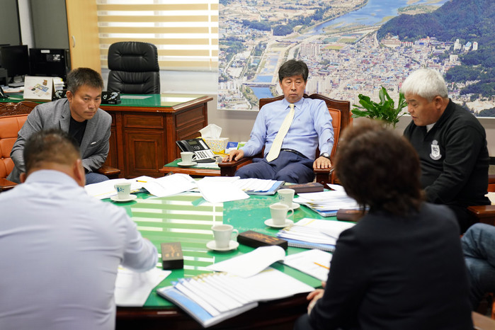 [양구군=세계타임즈 김민석 기자] 이상건 의장과 의원들이 8일 의장실에서 의원발의 조례안 제정, 안대리비행장 헬기 소음 측정 등의 내용으로 의원간담회가 열렸다.