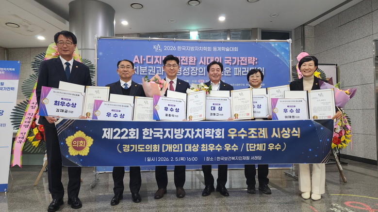 [경기도 세계타임즈=송민수 기자] 경기도의회(의장 김진경)가 5일 ‘제22회 한국지방자치학회 우수조례 시상식’에서 개인부문 대상과 단체부문 우수상 등 총 8건을 수상하며 전국 최고의 입법 역량을 입증했다.
