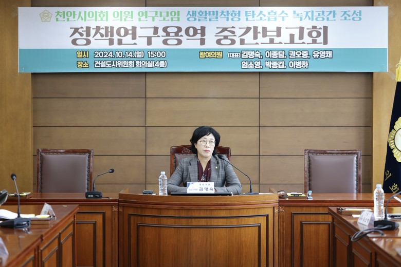 [천안시 세계타임즈=백택기 기자] 천안시의회(의장 김행금) ‘생활밀착형 탄소흡수 녹지공간 조성을 위한 연구모임’(김명숙 대표의원, 이종담, 권오중, 유영채, 엄소영, 박종갑, 이병하 의원)은 14일 건설도시위원회 회의실에서 제3차 간담회를 개최했다.