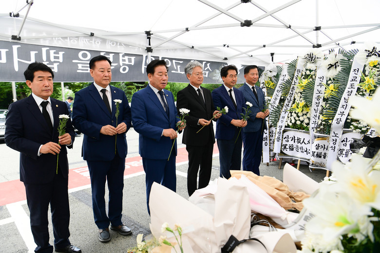 [경남 세계타임즈=최성룡 기자] 경상남도의회 의장단(의장 김진부)은 경상남도교육청에 마련된 서울 서이초 교사 추모 분향소를 찾아 추모하고 고인의 명복을 빌었다고 27일 밝혔다.