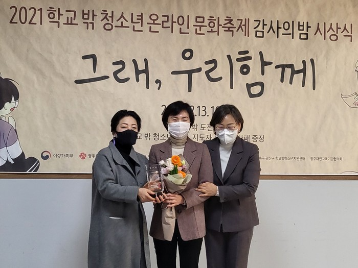 광주 학교밖청소년센터는 ‘2021 학교밖청소년온라인 문화축제 및 시상식’을 열고 한 해동안 참여해온 청소년과 지도자, 기관에게 시장상, 교육감상을 시상하고 장연주 의원에게 감사패를 시상하였다.