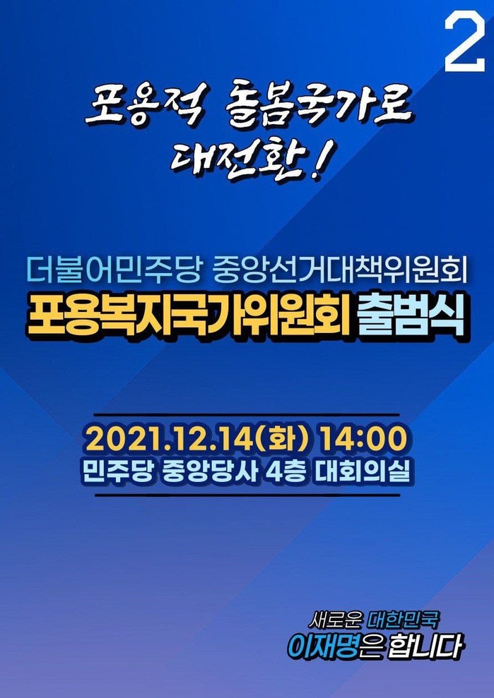 [세계타임즈 심귀영 기자]12월 14일(화) 오후2시, 더불어민주당 중앙당사 4층 대회의실에서 더불어민주당 제20대 대통령선거 중앙선거대책위원회 산하 ‘포용복지국가위원회(상임위원장: 남인순 국회의원)’ 의 출범식을 개최한다.
