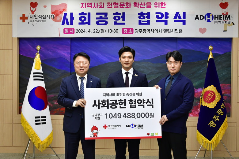 [광주 세계타임즈=손권일 기자] 대한적십자사 광주·전남혈액원은 ㈜애드하임과 22일 광주광역시의회 4층 열린시민홀에서 헌혈문화 확산을 위한 사회공헌협약을 체결했다고 밝혔다.