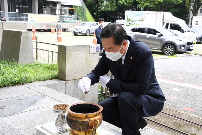 광주시의회에 따르면 후반기 광주시의회 의장단과 상임위원장단은 20일 광주독립운동기념탑을 시작으로 광주학생독립운동기념탑, 현충탑, 4‧19의거 희생 영령추모비, 국립5‧18민주묘지를 차례로 방문해 합동 참배했다.