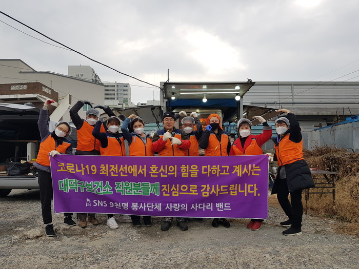 [대전=세계타임즈 이채봉 기자] 9천명 SNS 대전시 봉사단체 사랑의 사다리 밴드(리더 이정제)는 21일 오후3시,코 로나19 최전선에서 애쓰고 있는 대덕구보건소 100명의 직원들에게 바비큐 통닭 50마리 봉사로 우리 사회의 따뜻한 사랑을 전달하였다.