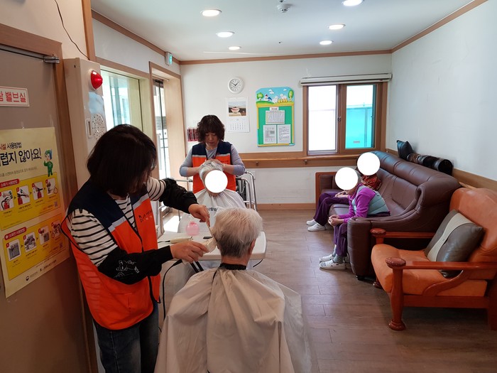이날 미용봉사는 송남석 단장을 비롯해서 김미경 김현옥 박유신 이미향 이하영 조은숙 가위천사들이 1층, 2층, 별관에서 치매 및 와상 어르신들 50명에게 미용봉사를 하였다.