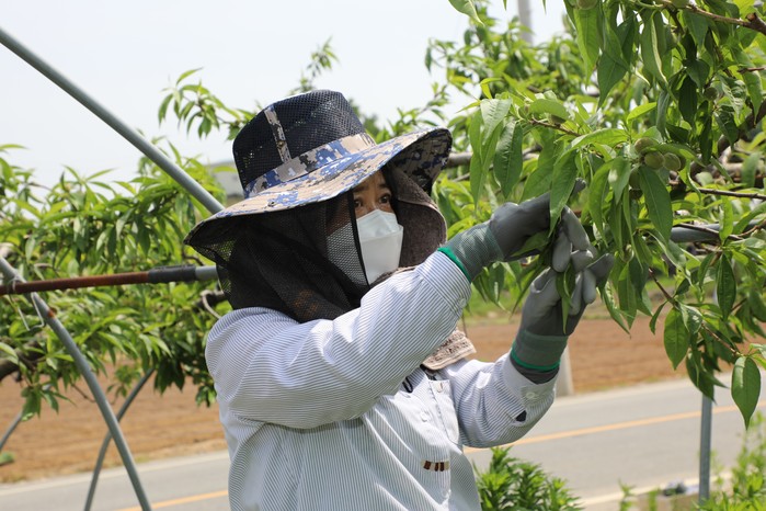봉사활동 참가자들은 복숭아 농장주와 함께 복숭아 열매솎기 작업을 진행하며 농번기를 맞아 일손이 부족한 농가에 힘을 보탰다.