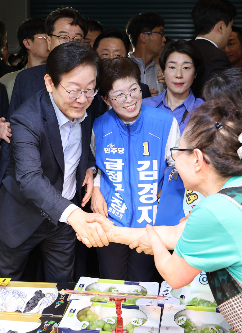 [세계타임즈 = 신상철 기자] 10·16 금정구청장 보궐 선거를 앞두고 24일 오후 부산 금정구 서동미로시장에서 이재명 더불어민주당 대표와 김경지 금정구청장 후보자·지도부가 상인 및 시민 등과 인사하며 지지를 호소하고 있다. 2024.9.24