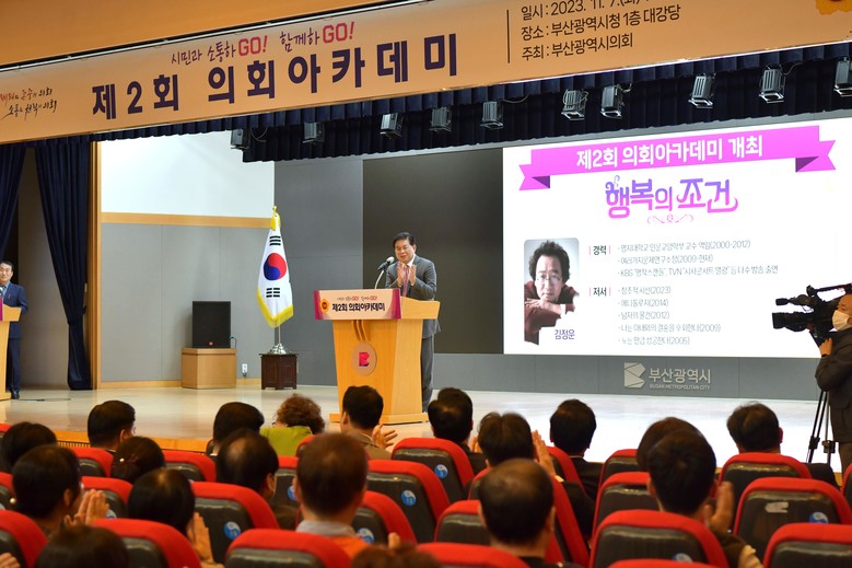의회아카데미는 다양한 분야의 명사를 초청한 강연을 개최하여 많은 부산시민과 함께하고 소통하기 위하여 마련한 행사다. 이번 제2회 의회아카데미에서는 「명작스캔들」, 「시사콘서트 열광」 등 TV 강연에 다수 출연하여 대중에게 친숙한 문화심리학자 김정운 소장을 초청하여,‘행복의 조건’이란 주제로 강연을 열었다.