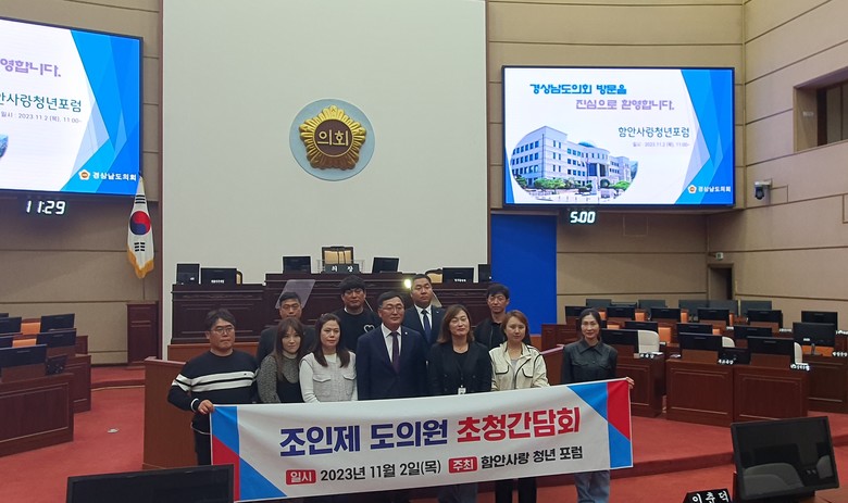 [경남 세계타임즈=최성룡 기자] 경상남도의회 조인제 의원(국민의힘, 함안2)은 2일 경남도의회 회의실에서 함안지역 청년 단체인 함안사랑청년포럼(회장 황미라) 회원 10여 명을 초청해 정책간담회를 개최했다고 밝혔다.