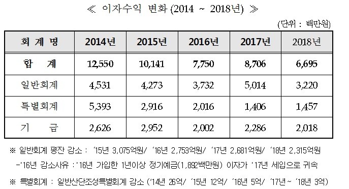 2014년부터 2018년까지 이자수익은 2014년 12,550백만원, 2015년 10,141백만원, 2016년 7,750백만원, 2017년 8,706백만원, 2018년 6,695백만원으로 계속 줄었는데, 이는 한국은행 기준금리가 낮아져 우리 시의 약정금리도 낮아진 이유도 있지만, 가장 큰 원인은 정부의 정책에 부합하는 우리 시의 신속집행에 따른 금고 평균잔액이 많이 줄었기 때문입니다.