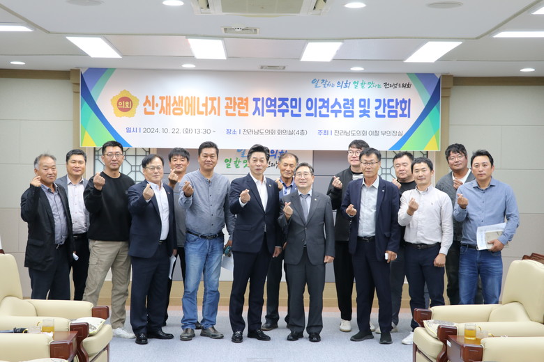 [전남 세계타임즈=우덕현 기자] 전라남도의회 이철 부의장(더불어민주당, 완도1)은 지난 10월 22일 전라남도의회 회의실에서 신·재생에너지 추진과 관련한 지역주민들의 목소리를 직접 듣기 위해 간담회를 개최했다.