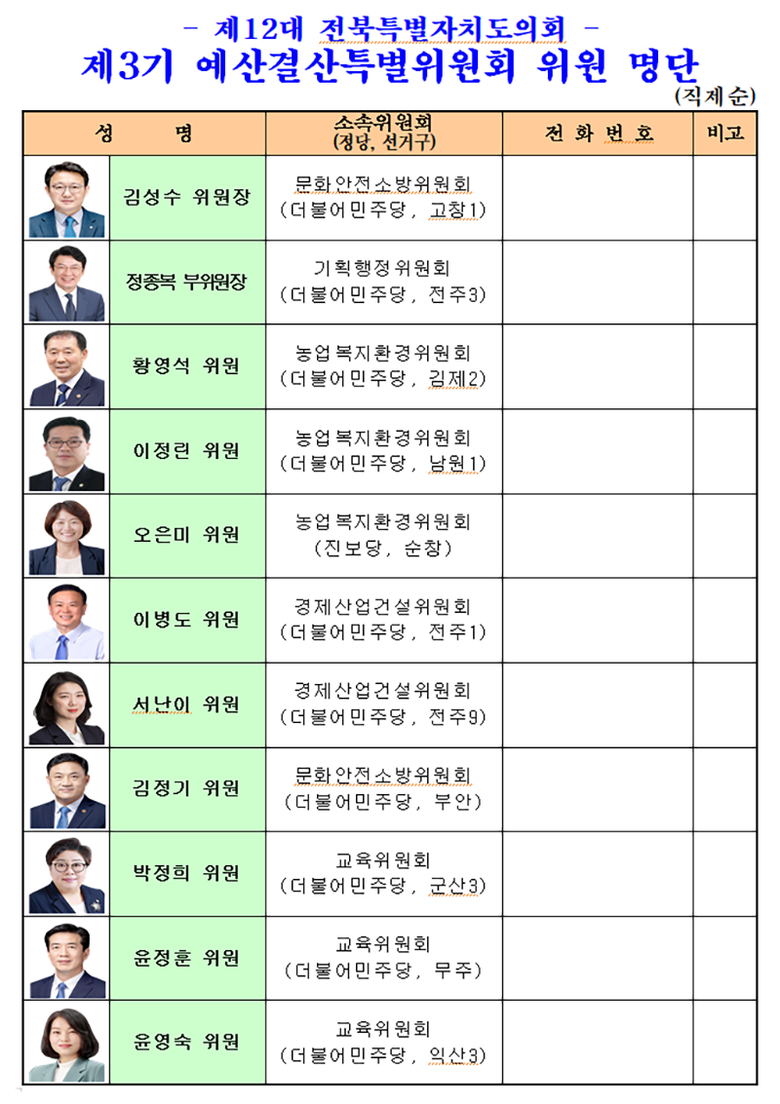 이날 선임된 예결위 위원들은 회의를 갖고 위원장에 김성수(더불어민주당, 고창1)의원을, 부위원장에 정종복(더불어민주당, 전주3)의원을 선출하고, 7월부터 제12대 제3기 예산결산특별위원회 활동을 본격 시작한다.