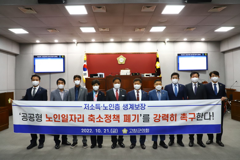 [고창군 세계타임즈 = 강옥선 기자] 고창군의회(의장 임정호)는 지난 21일 개회된 제293회 임시회 제2차 본회의에서 “공공형 노인일자리사업을 축소하는 정책을 폐기하라”는 건의안을 발표했다.