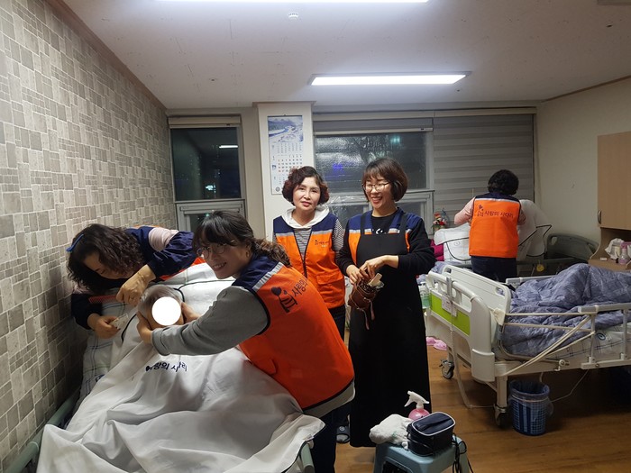 이날 미용봉사는 2층, 3층, 4층의 와상 어르신들에게 2시간동안 8명의 자원봉사자들이 함께 하였다.