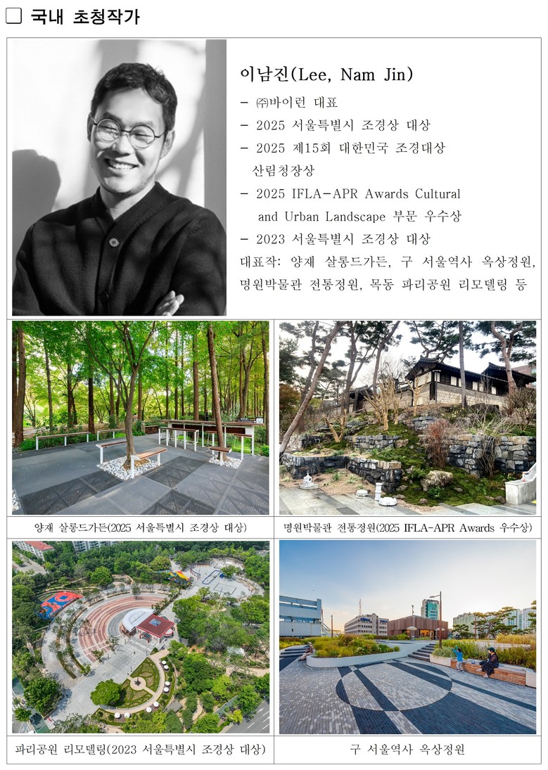 이남진 작가는 서울의 장소성과 일상, 도시 풍경을 섬세하게 해석해 온 국내 대표 조경가로, 서울 고유의 정원 언어를 깊이 있게 풀어낼 예정이다.