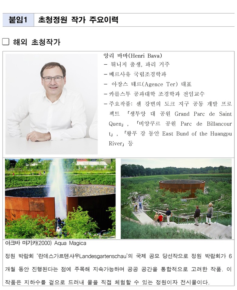 앙리 바바는 도시·건축·조경을 통합적으로 접근하는 조경설계사무소 ‘아장스 테르(Agence Ter)’의 대표이다. 프랑스 생투앙 대공원, 비양쿠르 공원, 중국 황푸강 동안, 푀플 드 레르브 공원 등 대규모 도시 공공공간 프로젝트를 통해 국제적 명성을 쌓아왔다. 특히 독일 정원박람회(Landesgartenschau) 국제공모 당선작 ‘아크바 마기카(Aqua Magica)’는 박람회 이후에도 존치되는 공공정원으로 조성돼 정원박람회가 일회성 전시에 그치지 않고 도시의 장기적 경관 자산으로 남을 수 있음을 보여준 대표 사례로 평가받고 있다.