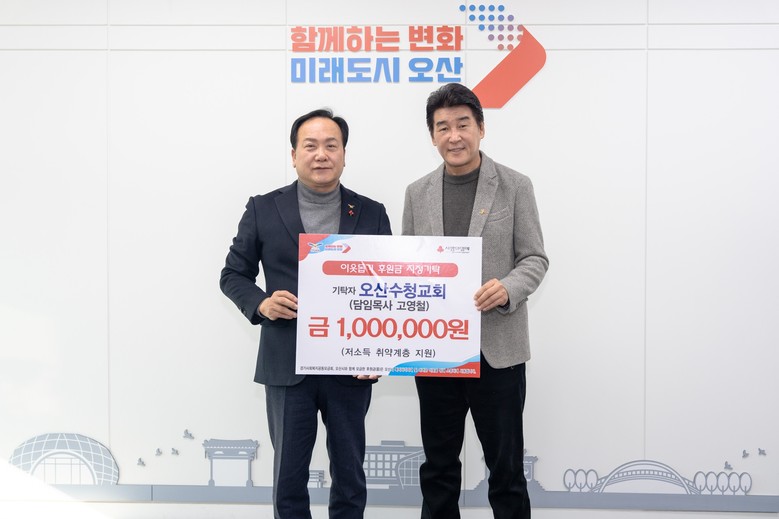 [오산시 세계타임즈=송민수 기자] 오산시(시장 이권재)는 지난 26일 오산수청교회(담임목사 고영철)가 희망2026나눔캠페인에 동참해 관내 취약계층 지원을 위한 성금 100만 원을 기탁했다고 밝혔다.