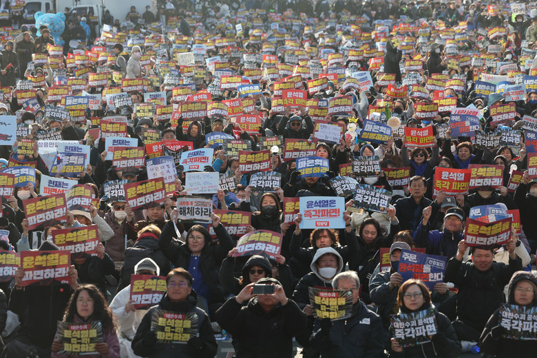 [세계타임즈 = 심귀영 기자] 29일 서울 종로구 서십자각 인근에서 윤석열 즉각퇴진·사회대개혁 17차 범시민대행진에서 참가자들이 구호를 외치고 있다. 2025.3.29