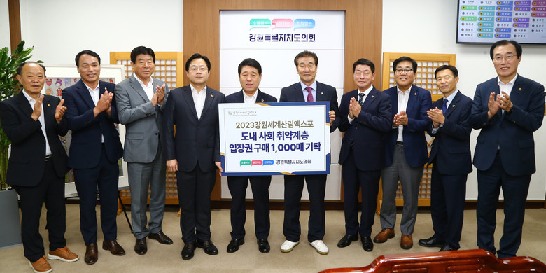 9월 15일 도의회 의장실에서 강원특별자치도사회복지협의회(회장 홍기종)와 산림엑스포 입장권 기탁식을 가지고, 도내 취약계층에게 지원할 2023 강원세계산림엑스포 입장권 1,000매를 전달했다고 밝혔다.
