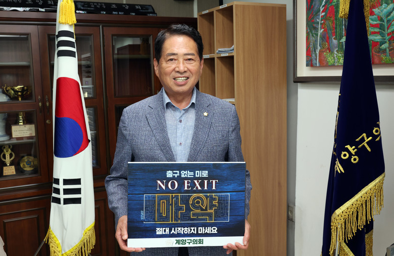 [계양구 세계타임즈=심하린 기자] 인천광역시 계양구의회 조양희 의장은 지난 28일 마약범죄 예방 ‘출구 없는 미로, NO EXIT’ 릴레이 캠페인에 동참했다.