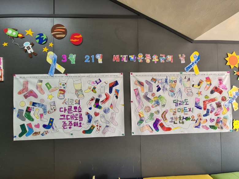 이번 놀이는 ‘티나의 양말’ 동화책을 활용하여 유아들의 흥미를 유도하고, 자연스럽게 장애이해교육을 진행하는 데 중점을 두었다. 연령별로 진행된 활동은 3세는 ‘다운증후군의 날 기념 리본 꾸미기’, 4세는 ‘달라도 얼마든지 괜찮아요, 협동 현수막 꾸미기’, 5세는 ‘서로의 다른 모습 그대로를 존중해요, 협동 현수막 꾸미기’ 등으로 구성됐다. 이를 통해 유아들은 다운증후군에 대한 이해를 높이고, 올바른 장애인관을 형성할 수 있었다.