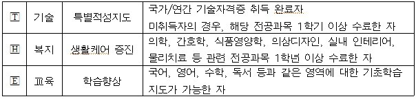 와락’은 T(기술)/H(복지)/E(교육) 영역과 전공이 연계된 대학생들이 멘토가 되어서 멘티와 함께(with:~와 함께) 즐거운(즐거울, 락 樂) 학습공동체를 구성해 나감을 뜻한다. 각 영역 멘토의 요건은 다음과 같다.