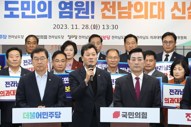 한편, 이날 기자회견에는 더불어민주당 신정훈, 국민의힘 김화진, 정의당 박명기, 진보당 이성수 위원장과 전라남도의회 의과대학 유치 대책위원회 최선국·신민호 공동위원장을 비롯해 대책위 소속 의원들이 함께했다.