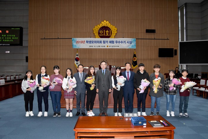 [광주=세계타임즈 손권일 기자] 광주광역시의회(의장 김동찬)는 2019년도 학생 모의의회 체험 우수수기 시상식을 2019.12.5.(목) 10시에 시의회 본회의장에서 개최하였다.